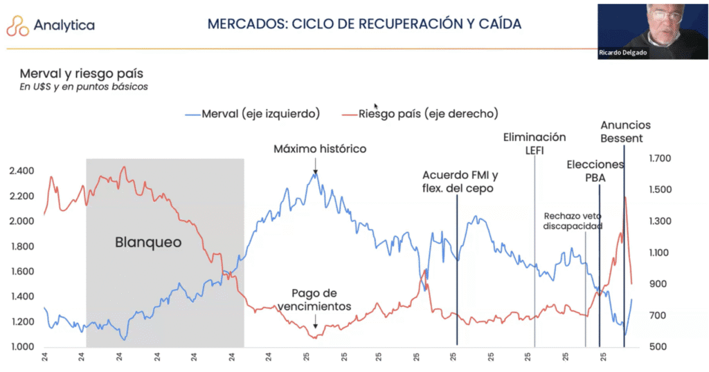 “Estamos claramente en un momento bisagra del esquema económico y también del dispositivo político del gobierno”, advirtió Ricardo Delgado al inicio de su exposición. “De este viernes al viernes anterior la economía argentina cambió radicalmente”, remarcó, subrayando la fragilidad de un modelo basado en el “dólar barato”, que lleva a que el país consuma más divisas de las que genera. A su juicio, el equilibrio fiscal “ha llegado para quedarse”, pero el desafío de fondo es recomponer reservas y corregir los incentivos cambiarios.